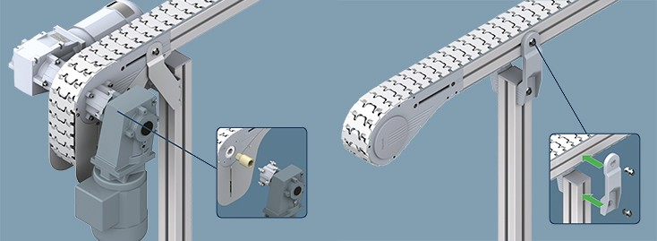 除配置垂直和水平弯道、弯轮、侧导向 和型材的输送段采用模块结构之外,驱 动方案同样也是模块化结构:具有不同 速度的驱动方案均为紧凑的结构,并且 都配置过载保护联轴器。带集成变频器 的电机能够在现场针对您的专门要求对 输送速度进行无级调整